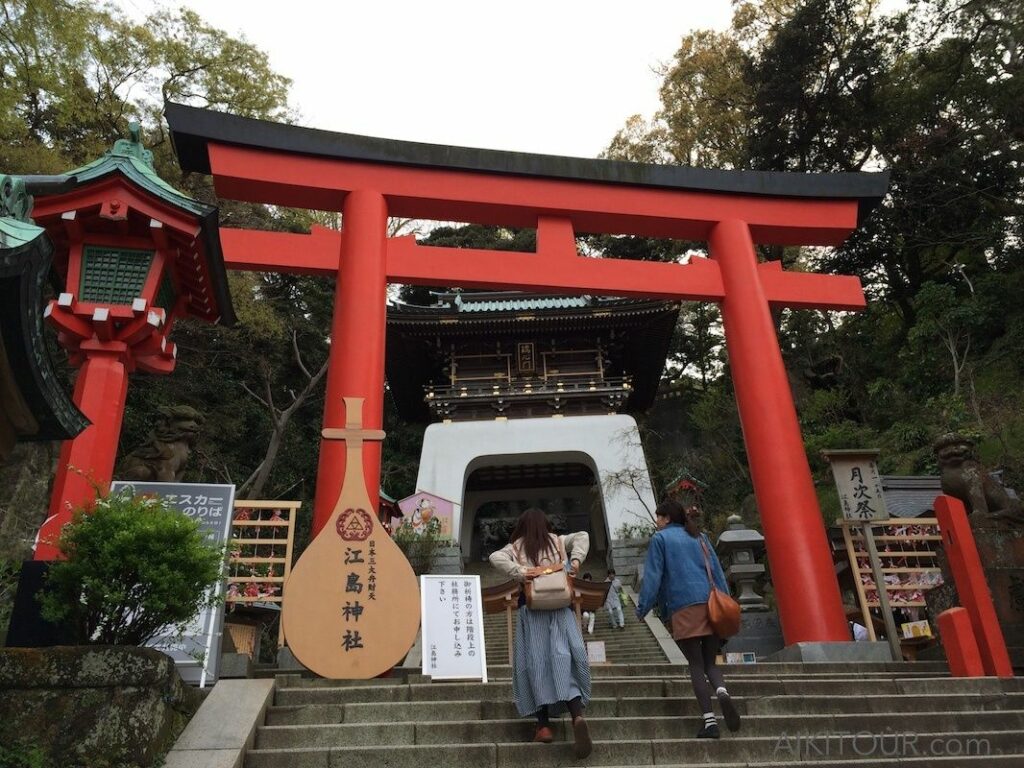 Le train Enoden relie les deux sites en longeant la côte qui offre de magnifiques points de vue sur l’ile d’Enoshima et sur le Mont Fuji par temps clair.