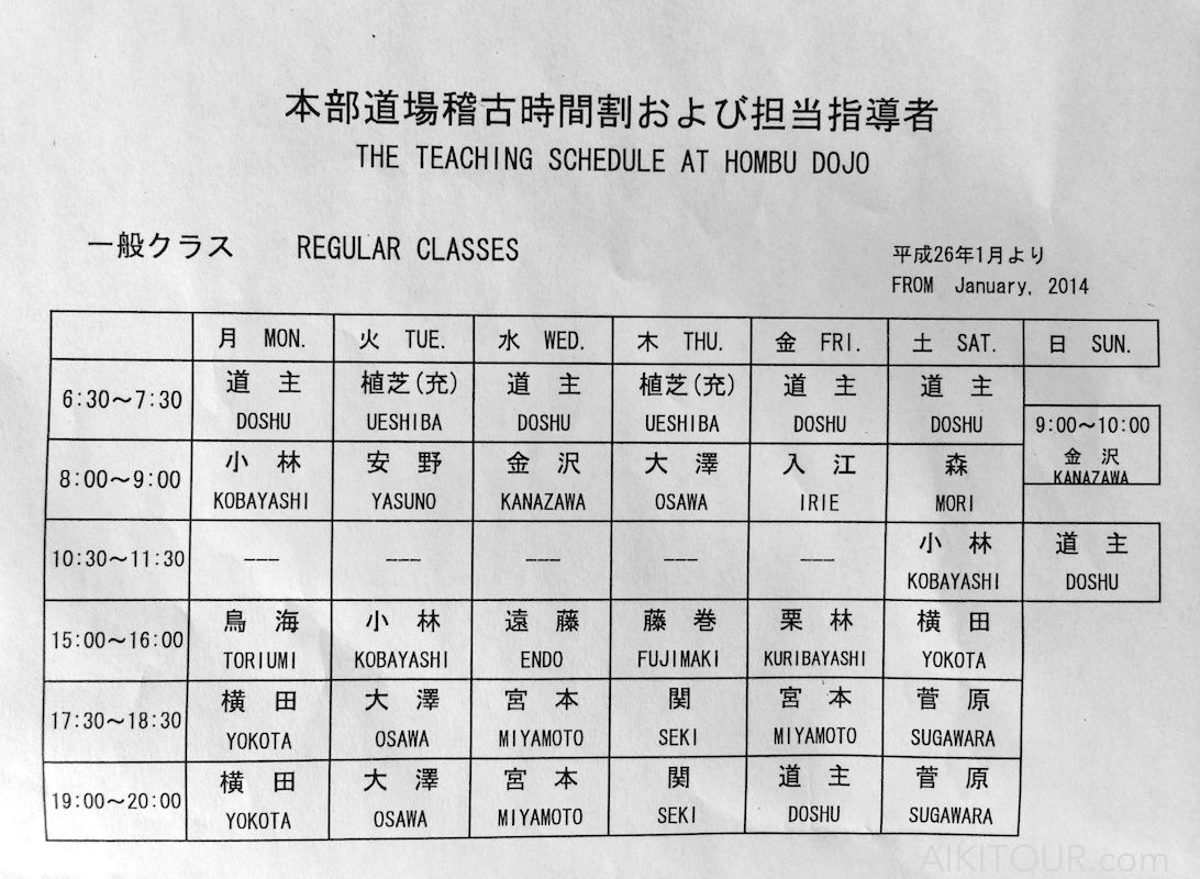 Planning des cours au Hombu Dojo